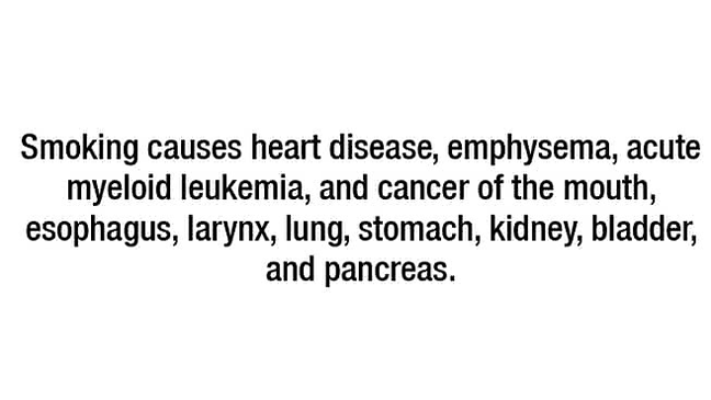 Các nội dung chính bao gồm cảnh báo về tác hại của thuốc lá như “Thuốc lá cướp đi trung bình 1.200 sinh mạng người Mỹ mỗi năm”, “Mỗi năm ngày càng có nhiều người chết vì thuốc lá hơn là vì các nguyên nhân khác như bị giết, AIDS, tự tử, ma túy, tai nạn giao thông, rượu bia,...”, cùng với việc liệt kê một số bệnh cùng các triệu trứng do hút thuốc.